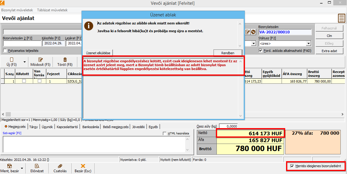 • Ha egy bizonylat tömbhöz engedélyezés van beállítva, akkor a bizonylat mentésekor a bizonylat összes nettó értéke alapján dönti el a program, hogy szükség van-e engedélyezésre. Ilyen esetben a program automatikusan ideiglenes bizonylatként menti el a készítendő bizonylatot. Ezzel párhuzamosan az engedélyező személynek elküldésre kerül egy e-mail "Engedélyezésre váró bizonylat készült" tárgy megjelöléssel.