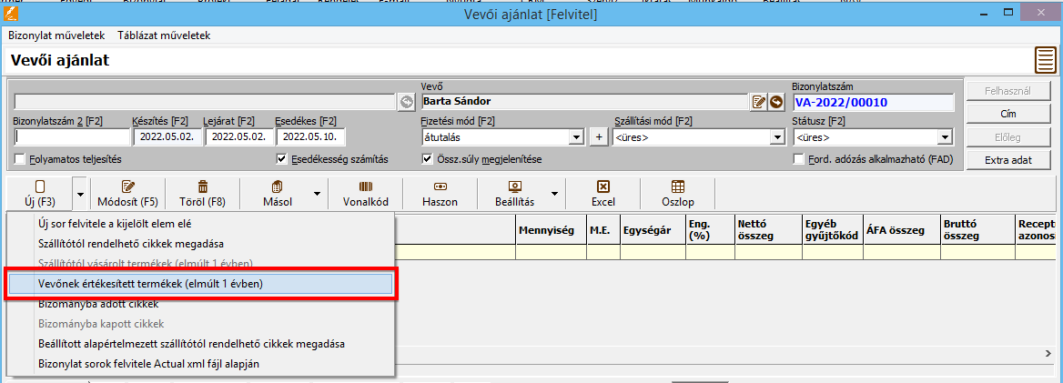 • Bizonylat űrlapon az [Új] sor melletti menüben új menüpontok: