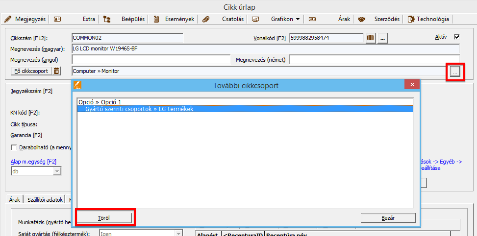 • Cikk űrlap - további cikkcsoport ablakban [Töröl] gomb: további cikkcsoportba sorolás törlése.