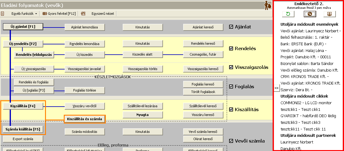 • Emlékeztető 2. panel: az utoljára rögzített adatok gyors megtekintése. A fő képernyő jobb oldalán választható ki, és az utoljára módosított eseményeket jeleníti meg (pl. bizonylatok, projektek, CRM, szerviz, házipénztár, bank). A megjelenő szövegre kattintva megnyílik az adott esemény űrlapja.