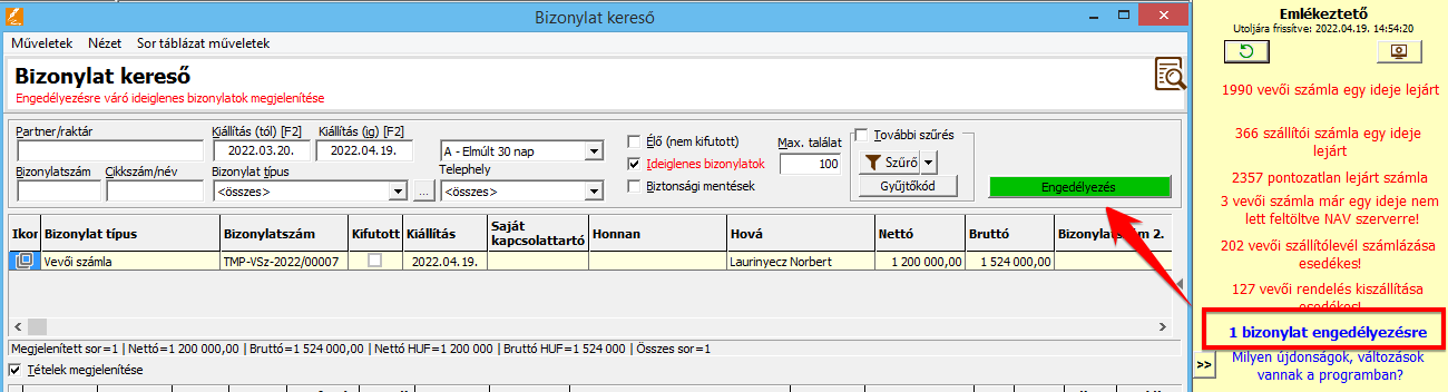 • A fő képernyő jobb oldalán az Emlékeztető panelen automatikusan megjelenik egy új emlékeztető "Engedélyezésre váró bizonylatok" néven. Erre kattintva a program megjeleníti az összes, az adott (bejelentkezett) felhasználó engedélyére váró bizonylatot a Bizonylat kereső ablakban. A Bizonylat keresőben az [Engedélyezés] gombot megnyomva történik meg az engedélyezés, amely az ideiglenes bizonylat élesítését jelenti. Az éles, engedélyezett bizonylatban a rendszer eltárolja a dátumot, és az engedélyező felhasználó azonosítóját. Az engedélyezésről a bizonylat készítője egy automatikus értesítést (e-mailben) kap, hogy az adott számú bizonylat engedélyezésre került. Az engedélyezett (éles) bizonylatot érdemben már nem lehet módosítani!