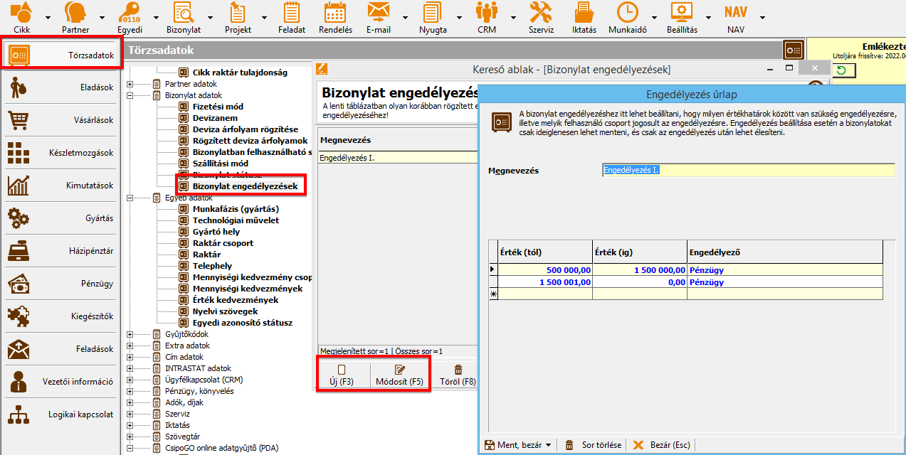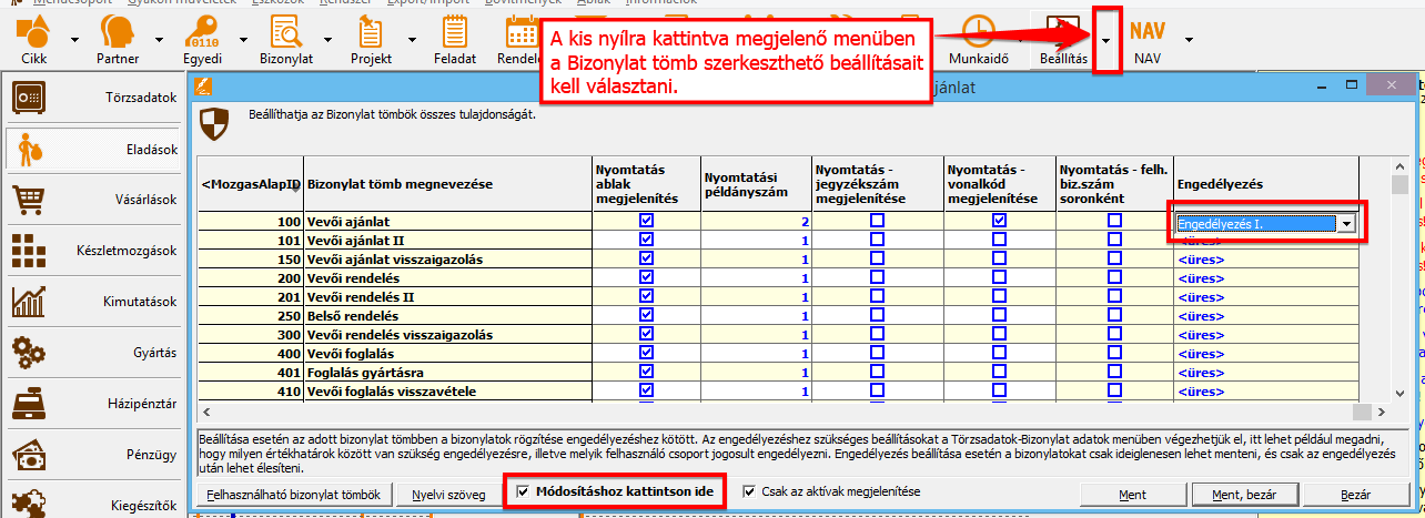 • Bizonylatok engedélyezése