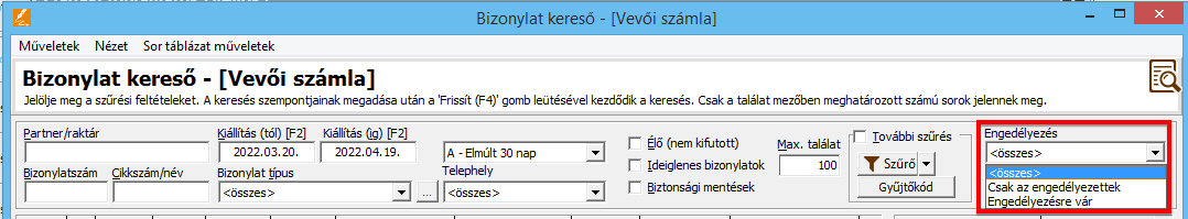 • "Engedélyezés" listadoboz, amelynek lehetséges értékei: "<összes>", "csak az engedélyezettek", "engedélyezésre vár"a további szűrési feltételek ablakban az engedélyező személy nevére is lehet szűrni