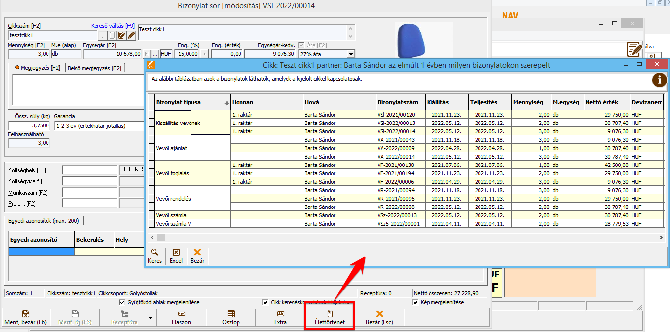 • Bizonylat sor felviteli ablakban alul [Élettörténet] gomb: az adott bizonylat sorban szereplő cikk, az adott bizonylaton lévő partner elmúlt 1 évben kiállított bizonylat sorait mutatja meg. Ennek segítségével akár a bizonylat felvitele közben ellenőrizhetjük, hogy az adott partner részére az elmúlt 1 évben milyen áron készültek bizonylatok.