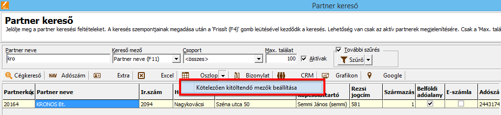 • Partner rögzítéshez beállíthatók a kötelezően kitöltendő mezők a Cikk keresőben az [Oszlop] ikon melletti „Kötelezően kitöltendő mezők” menüben