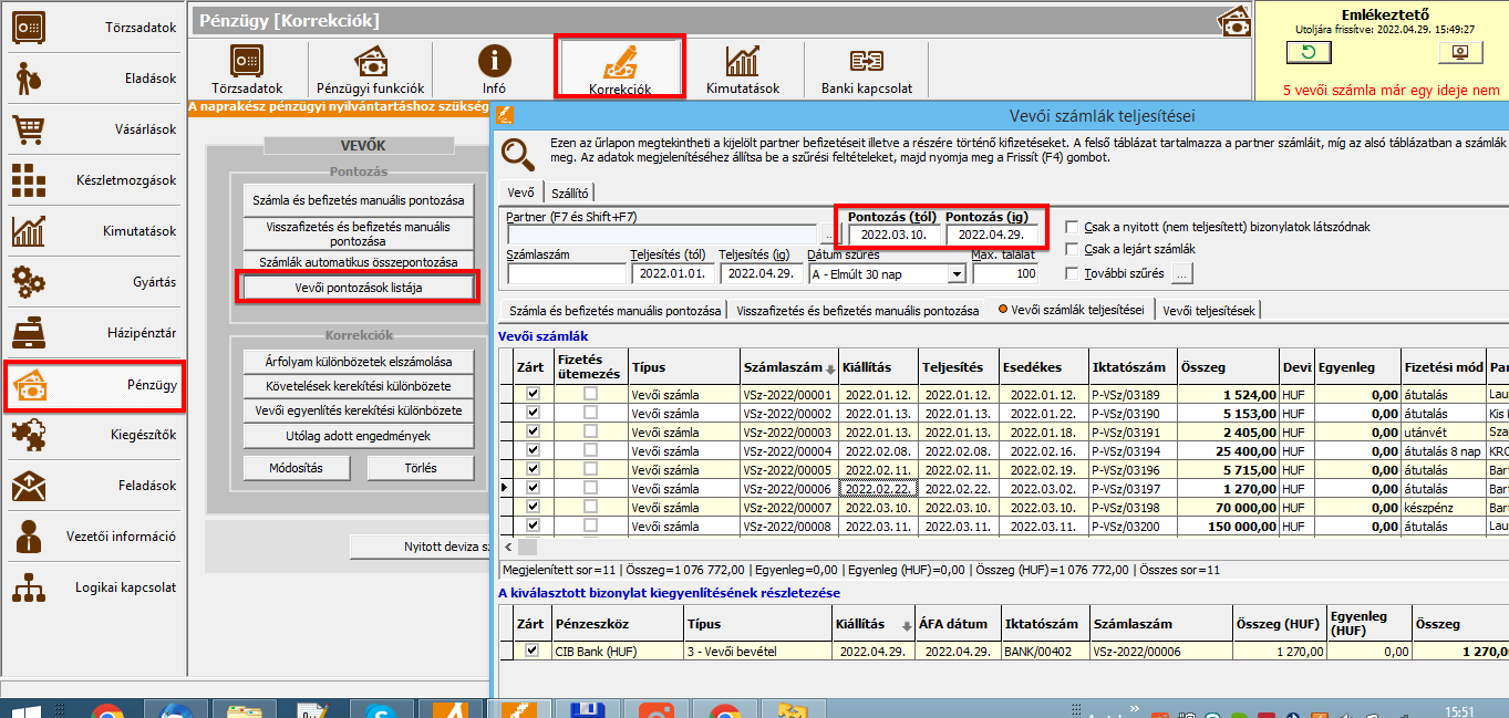 • A pontozás (párosítás) ideje alapján is lekérhetjük a számlákat illetve fizetéseket a pénzügyben, azaz megnézhetjük, hogy egy adott időszakban milyen számlát és fizetést pontozott össze a program (akár automatikusan, akár manuálisan). Pénzügy - Korrekciók - Vevői pontozások listája illetve Szállítói pontozások listája: a fizetés (pontozás) dátuma szerint kérhetjük le számláinkat vagy a bankot/pénztárat. A szűrési ablakban a "Pontozás (tól)" és "Pontozás (ig)" mezőket használva egy adott időszakban megtörtént pontozásokat kérhetjük le akár számlák szerint (a számla milyen módon lett kiegyenlítve), akár bank és pénztár szerint (a bank/pénztár milyen számlát egyenlített ki). A számlák illetve a kiegyenlítés (bank/pénztár) táblázatban megjeleníthetjük az alábbi új oszlopokat: