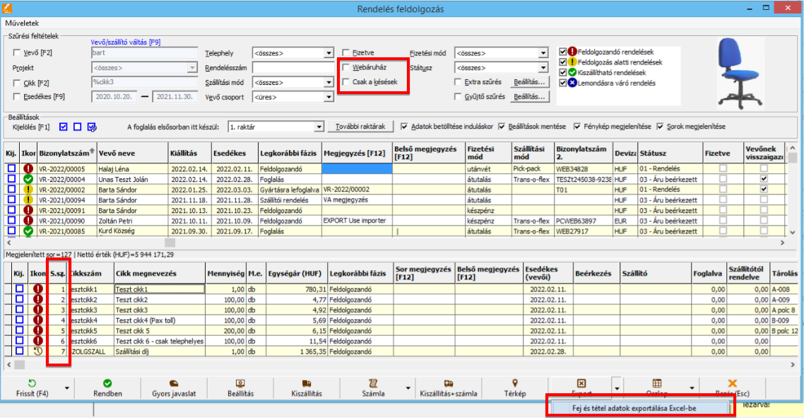 • A szűrési feltételek között megjelent a "Csak a késések" opció, amely kipipálása esetén csak azok a nyitott vevői rendelés tételek jelennek meg a táblázatban, amelyek várható beszállítási dátuma ("Beérkezés" oszlop) későbbi, mint az eredeti vevői visszaigazolásban szereplő dátum ("Esedékes (vevői)" oszlop), és a szállítói rendelés sorának van szállítói visszaigazolása.