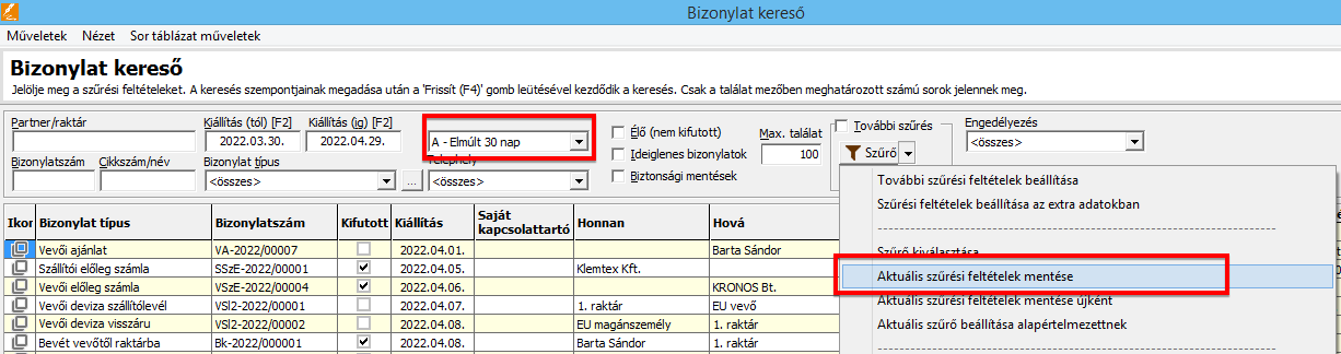 • A bizonylat készítője az így engedélyezett (élesített) bizonylatokat a Bizonylat keresőben ellenőrizheti. A Bizonylat keresőben új szűrési feltételek kerültek kialakításra: