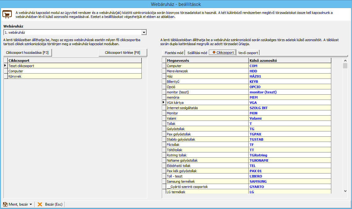 • Beállítás – webáruház szinkronizáció: a webáruházakhoz kapcsolódó különböző törzsadatok beállításait lehet elvégezni ezen az űrlapon. Több webáruház kezelése esetén összesen 6 webáruházhoz lehet beállítani a különböző törzsadatokat: szállítási mód, fizetési mód, cikkcsoport, vevő csoport. Ugyanitt lehet beállítani azt is, hogy az egyes webáruházakba milyen cikkcsoportba tartozó cikkek exportálása történjen meg.
